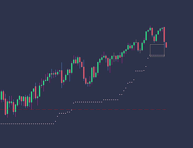 Чтобы увеличить прибыль в сделке на покупку, постепенно передвигайте стоп-лосс за белыми точками, пока они не станут красными. Для продаж процесс зеркальный.