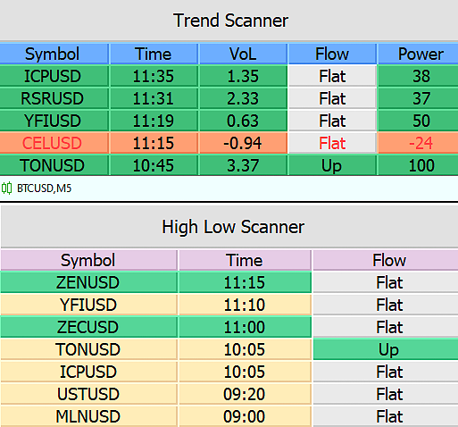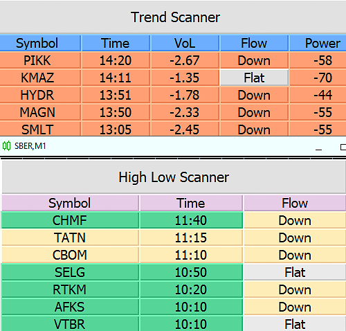 Когда сканеры найдут сигнал, вы услышите звуковое уведомление и увидите символ в таблице. Для открытия нужного графика, нажмите кнопку в столбце "Symbol".
