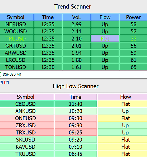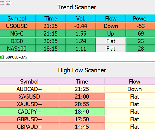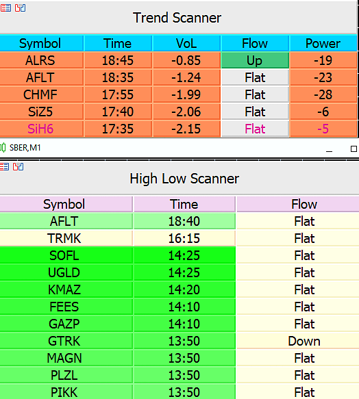 Когда сканеры найдут сигнал, вы услышите звуковое уведомление и увидите символ в таблице. Для открытия нужного графика, нажмите кнопку в столбце "Symbol".