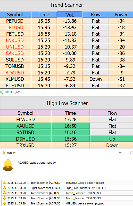 Когда сканеры найдут сигнал, вы услышите звуковое уведомление и увидите символ в таблице. Для открытия нужного графика, нажмите кнопку в столбце "Symbol".